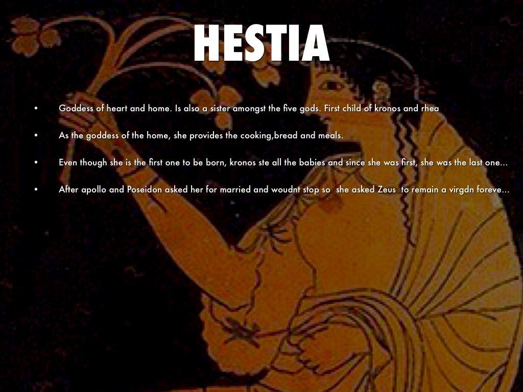 Goddess of heart and home. Is also a sister amongst the five gods. First child of kronos and rhea