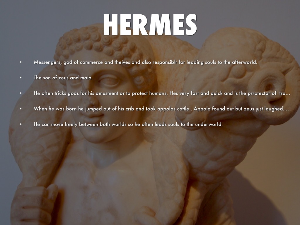 When he was born he jumped out of his crib and took appolos cattle . Appolo found out but zeus just laughed. Herme s then gave his lyre he invented to appolo.