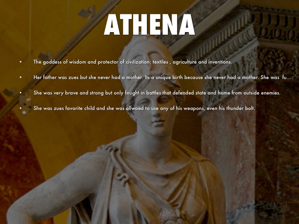 The goddess of wisdom and protector of civilization: textiles , agriculture and inventions.