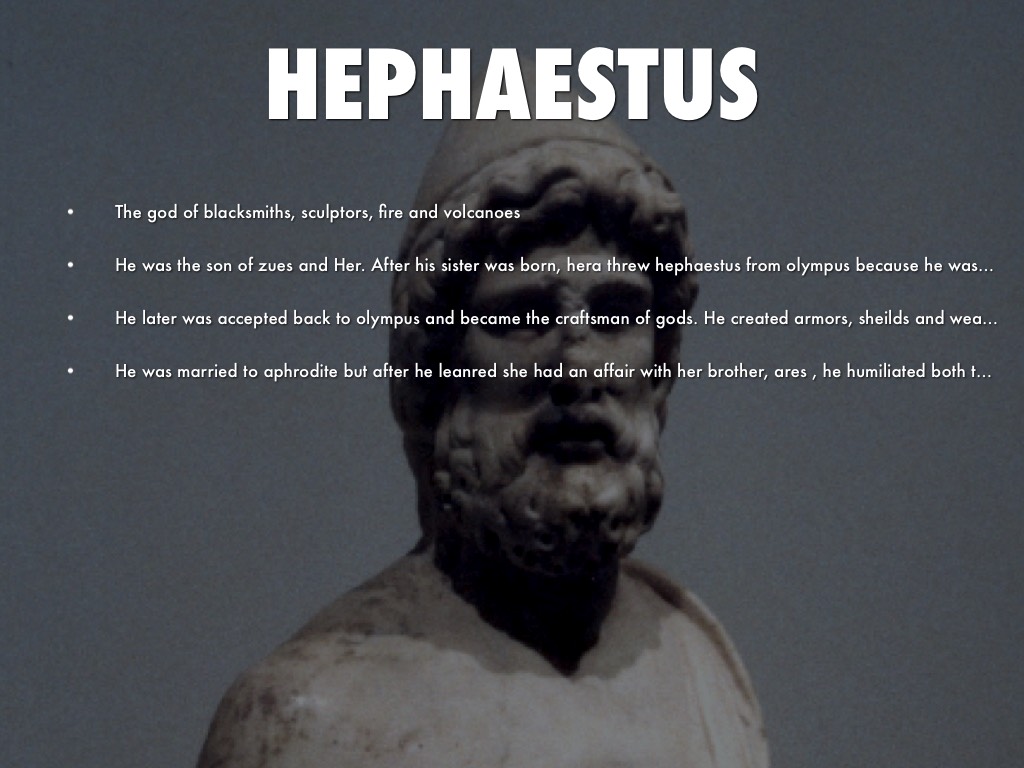 He was the son of zues and Her. After his sister was born, hera threw hephaestus from olympus because he was crippled. He fell into the ocean and was raised by thetis and eurynam. Zues and hera had no feelings for him since he was crippled and ugly.