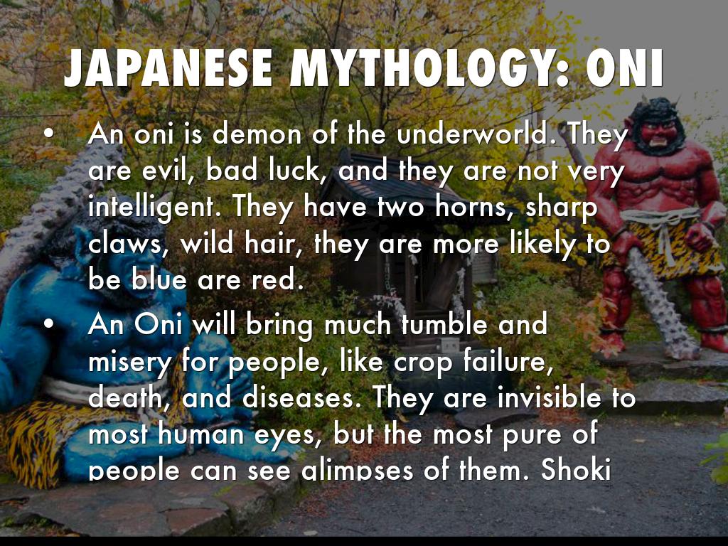 An oni is demon of the underworld. They are evil, bad luck, and they are not very intelligent. They have two horns, sharp claws, wild hair, they are more likely to be blue are red.
