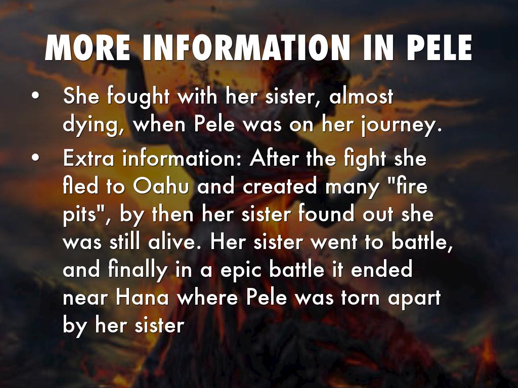 Extra information: After the fight she fled to Oahu and created many "fire pits", by then her sister found out she was still alive. Her sister went to battle, and finally in a epic battle it ended near Hana where Pele was torn apart by her sister