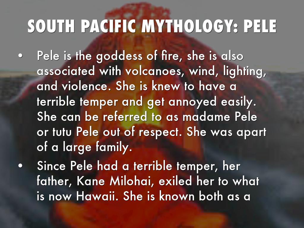 Pele is the goddess of fire, she is also associated with volcanoes, wind, lighting, and violence. She is knew to have a terrible temper and get annoyed easily. She can be referred to as madame Pele or tutu Pele out of respect. She was apart of a large family.