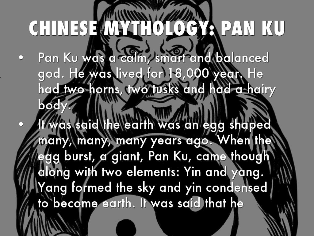 It was said the earth was an egg shaped many, many, many years ago. When the egg burst, a giant, Pan Ku, came though along with two elements: Yin and yang. Yang formed the sky and yin condensed to become earth. It was said that he came to construct heaven and earth.