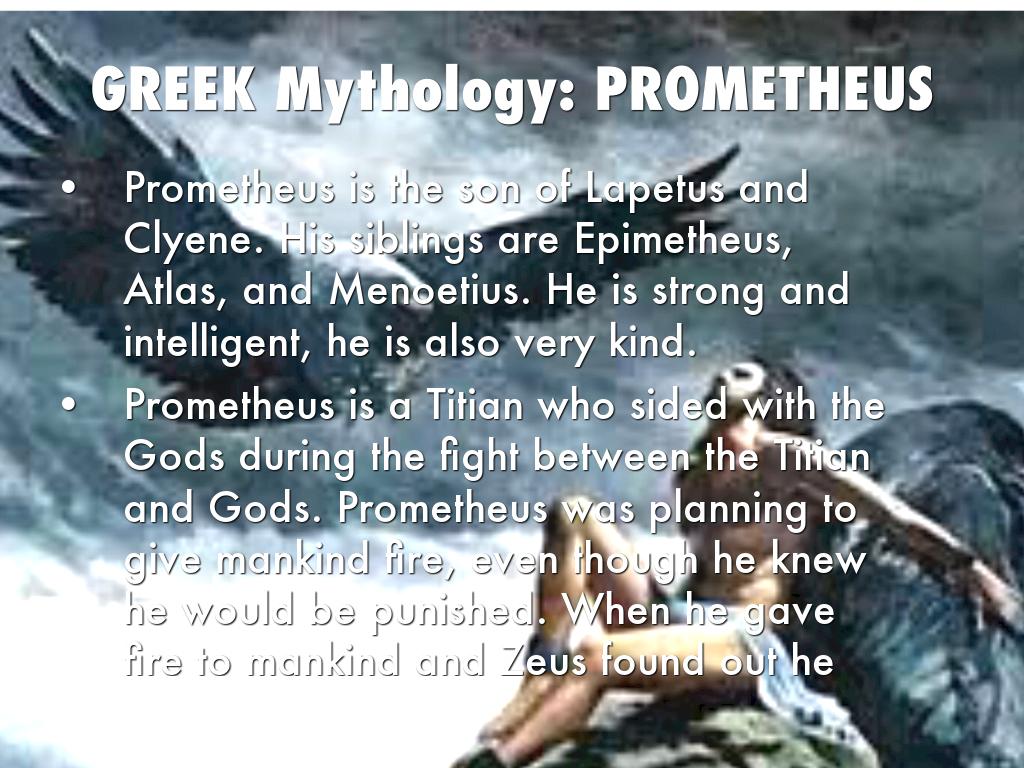 Prometheus is a Titian who sided with the Gods during the fight between the Titian and Gods. Prometheus was planning to give mankind fire, even though he knew he would be punished. When he gave fire to mankind and Zeus found out he was punished. Zeus had bounded him to a rock and had an eagle eat his liver out everyday.