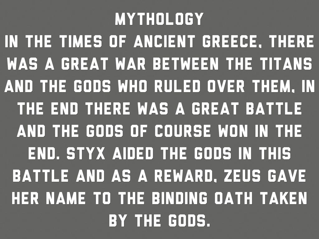In the times of Ancient Greece, there was a Great War between the titans and the gods who ruled over them, in the end there was a great battle and the gods of course won in the end. Styx aided the gods in this battle and as a reward, Zeus gave her name to the binding oath taken by the gods.