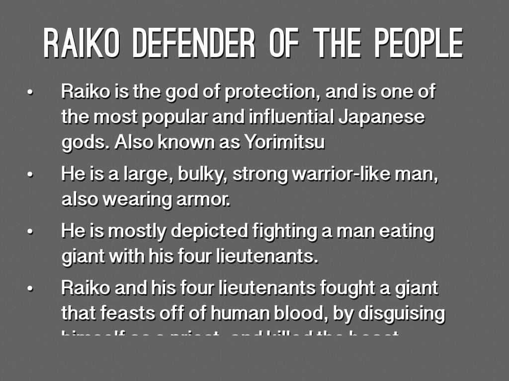 • Raiko is the god of protection, and is one of the most popular and influential Japanese gods. Also known as Yorimitsu