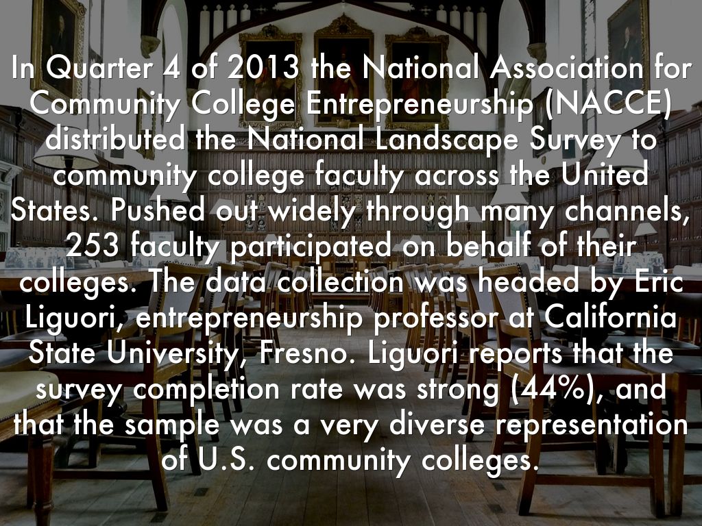 In Quarter 4 of 2013 the National Association for Community College Entrepreneurship (NACCE) distributed the National Landscape Survey to community college faculty across the United States. Pushed out widely through many channels, 253 faculty participated on behalf of their colleges. The data collection was headed by Eric Liguori, entrepreneurship professor at California State University, Fresno. Liguori reports that the survey completion rate was strong (44%), and that the sample was a very diverse representation of U.S. community colleges.