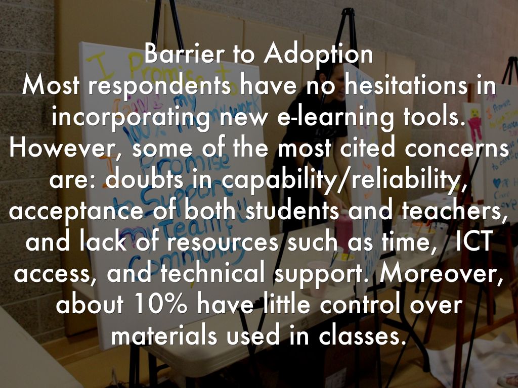 Barrier to Adoption Most respondents have no hesitations in incorporating new e-learning tools. However, some of the most cited concerns are: doubts in capability/reliability, acceptance of both students and teachers, and lack of resources such as time, ICT access, and technical support. Moreover, about 10% have little control over materials used in classes.