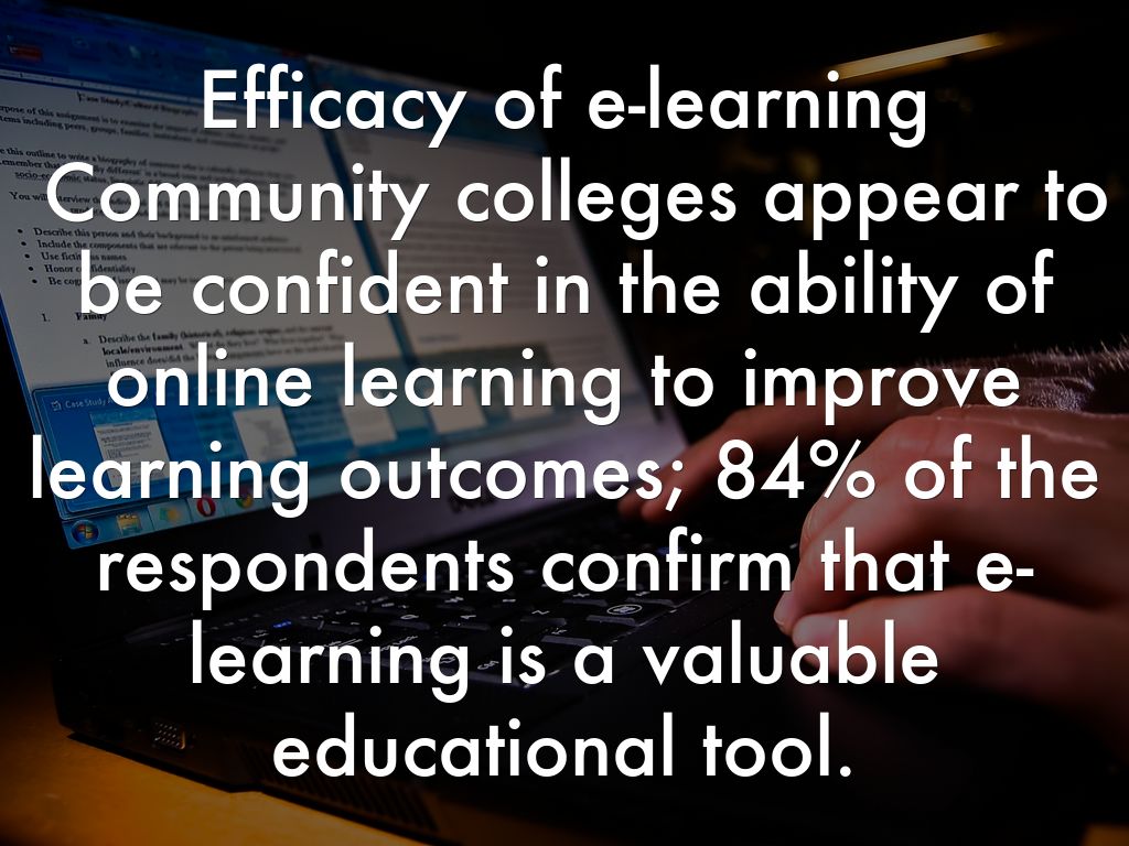 Efficacy of e-learning Community colleges appear to be confident in the ability of online learning to improve learning outcomes; 84% of the respondents confirm that e-learning is a valuable educational tool.