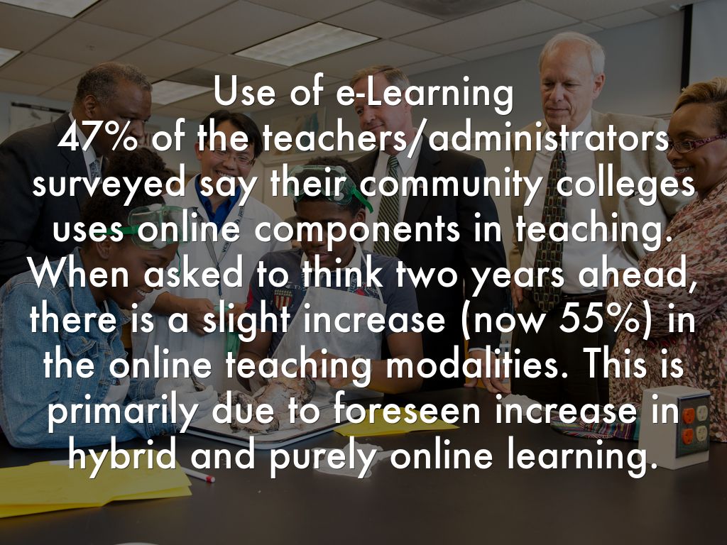 Use of e-Learning 47% of the teachers/administrators surveyed say their community colleges uses online components in teaching. When asked to think two years ahead, there is a slight increase (now 55%) in the online teaching modalities. This is primarily due to foreseen increase in hybrid and purely online learning.