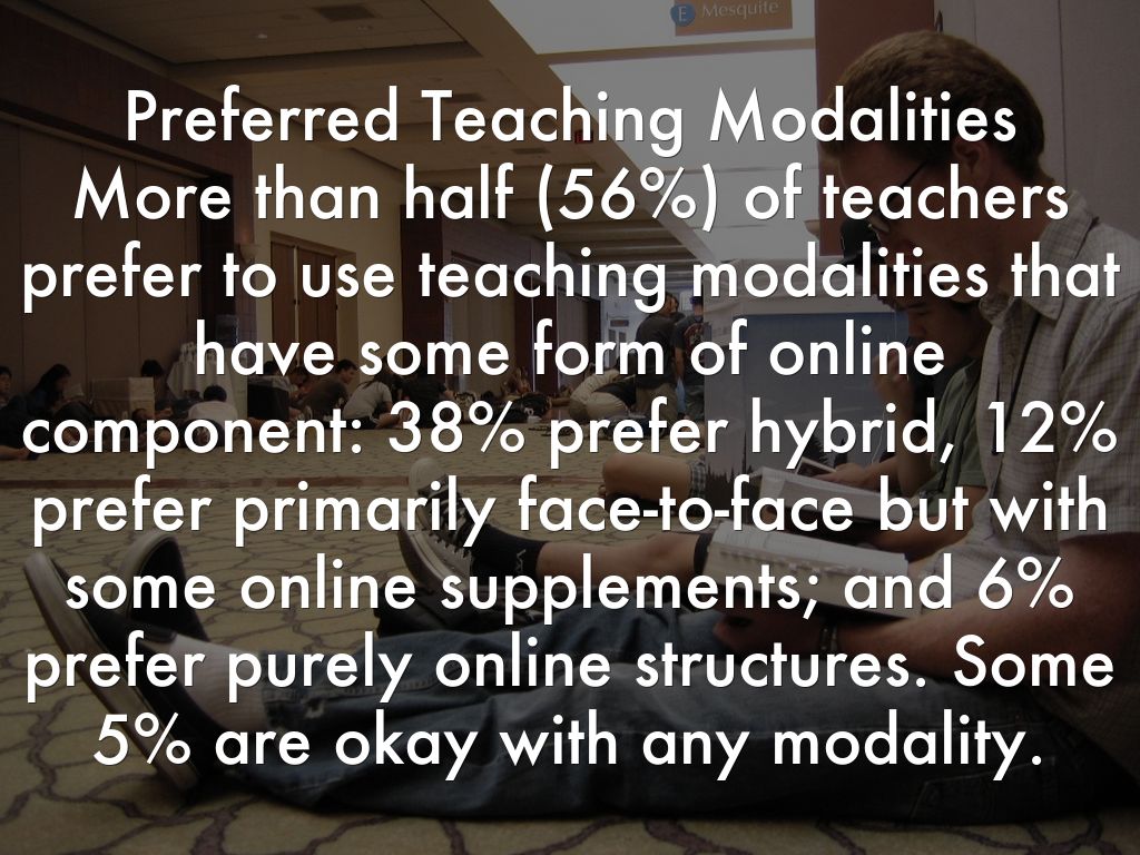 Preferred Teaching Modalities More than half (56%) of teachers prefer to use teaching modalities that have some form of online component: 38% prefer hybrid, 12% prefer primarily face-to-face but with some online supplements; and 6% prefer purely online structures. Some 5% are okay with any modality.