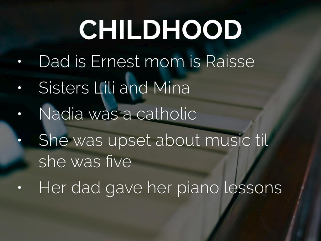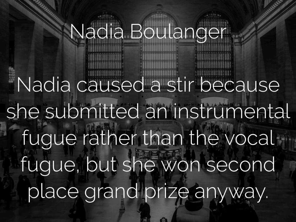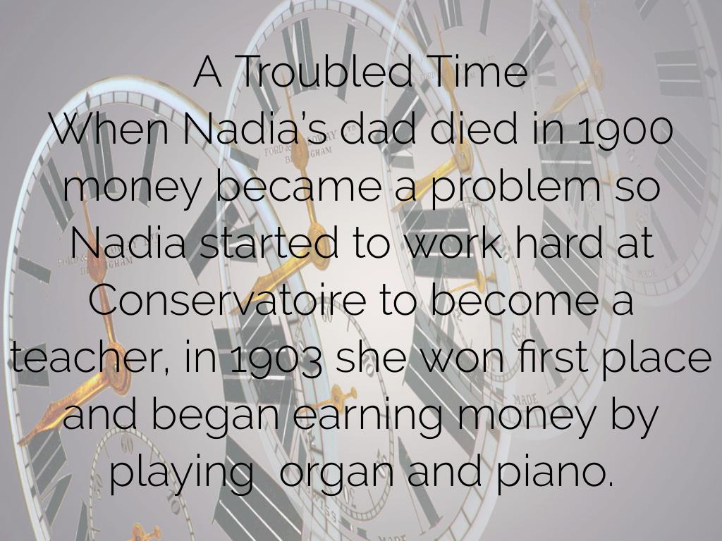 A Troubled Time When Nadia’s dad died in 1900 money became a problem so Nadia started to work hard at Conservatoire to become a teacher, in 1903 she won first place and began earning money by playing organ and piano.