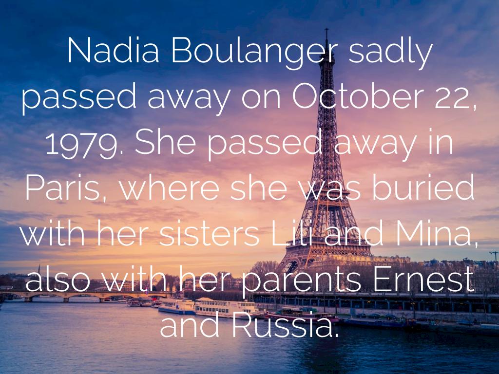 Nadia Boulanger sadly passed away on October 22, 1979. She passed away in Paris, where she was buried with her sisters Lili and Mina, also with her parents Ernest and Russia.