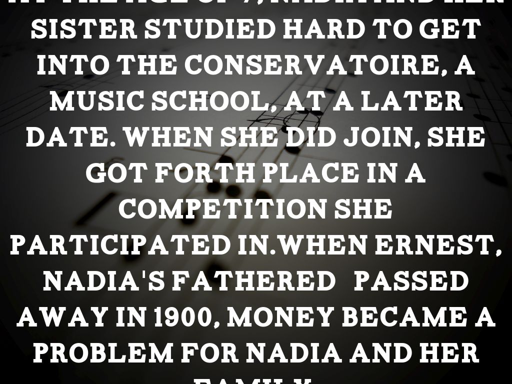 At the age of 7, Nadia and her sister studied hard to get into the Conservatoire, a music school, at a later date. When she did join, she got forth place in a competition she participated in.When Ernest, Nadia's fathered passed away in 1900, money became a problem for Nadia and her family.