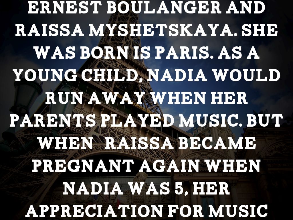 Nadia's parents were Ernest Boulanger and Raissa Myshetskaya. She was born is Paris. As a young child, Nadia would run away when her parents played music. But when Raissa became pregnant again when Nadia was 5, her appreciation for music changed.