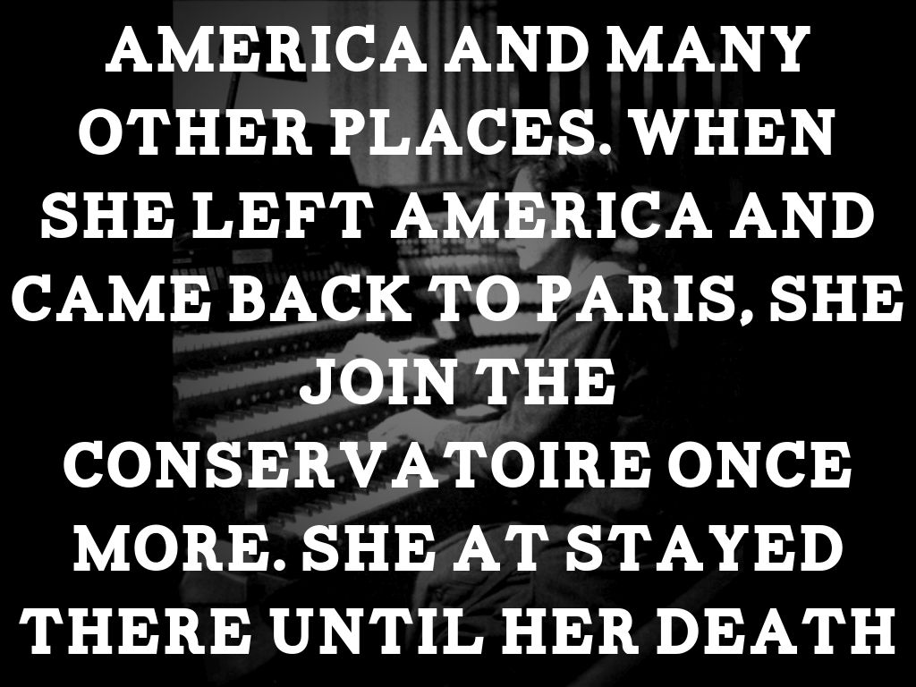 Nadia toured in America and many other places. When she left America and came back to Paris, she join the Conservatoire once more. She at stayed there until her death in 1979.