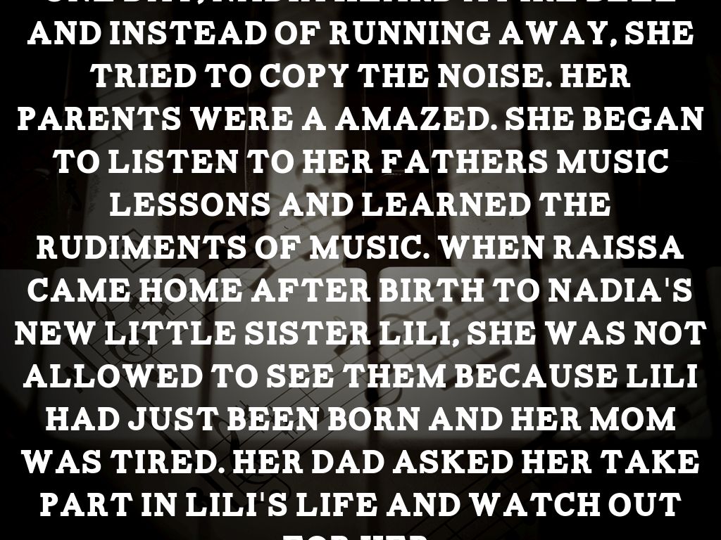 One day, Nadia heard a fire bell and instead of running away, she tried to copy the noise. Her parents were a amazed. She began to listen to her fathers music lessons and learned the rudiments of music. When Raissa came home after birth to Nadia's new little sister Lili, she was not allowed to see them because LilI had just been born and her mom was tired. Her dad asked her take part in Lili's life and watch out for her.