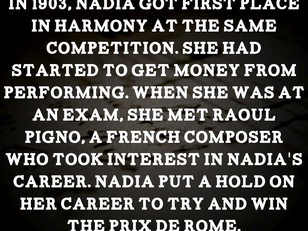 In 1903, Nadia got first place in harmony at the same competition. She had started to get money from performing. When she was at an exam, she met Raoul Pigno, a French composer who took interest in Nadia's career. Nadia put a hold on her career to try and win the Prix de Rome.
