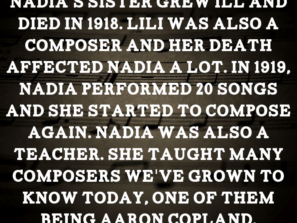 Nadia's sister grew ill and died in 1918. LilI was also a composer and her death affected Nadia a lot. In 1919, Nadia performed 20 songs and she started to compose again. Nadia was also a teacher. She taught many composers we've grown to know today, one of them being Aaron Copland.