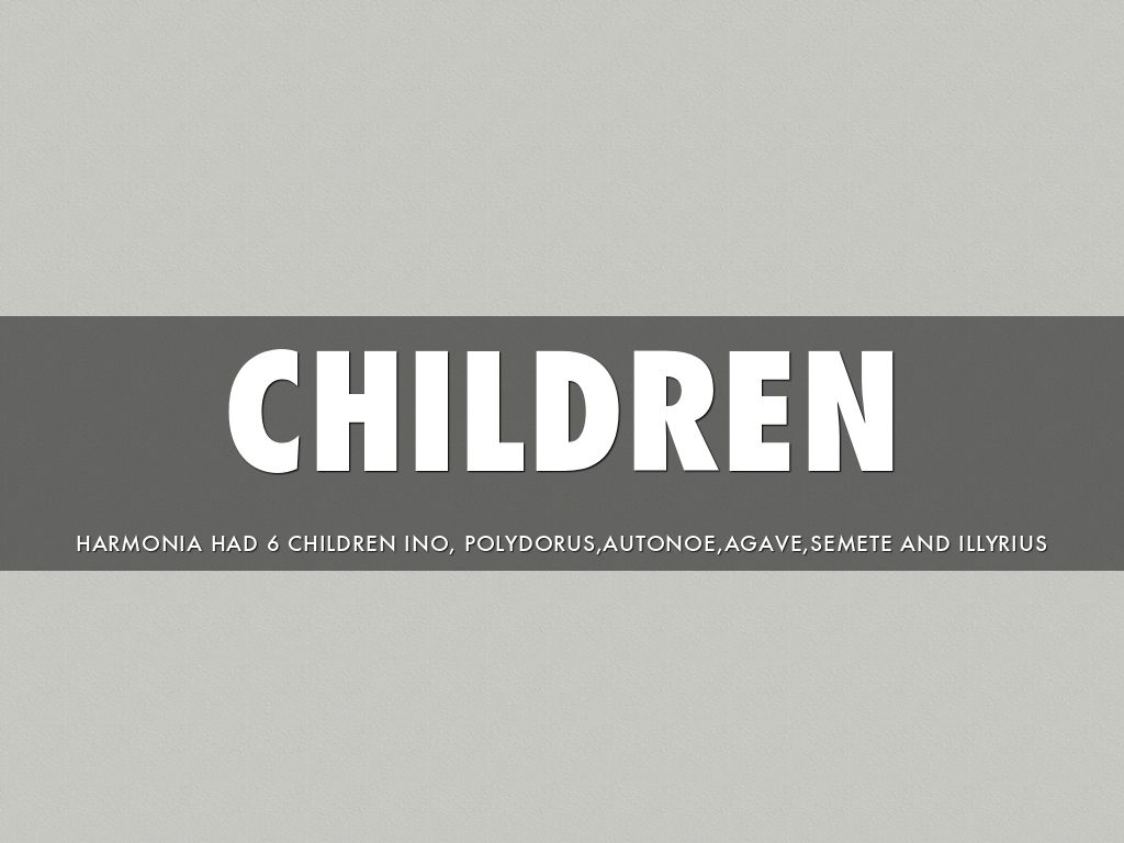HARMONIA HAD 6 CHILDREN INO, POLYDORUS,AUTONOE,AGAVE,SEMETE AND ILLYRIUS