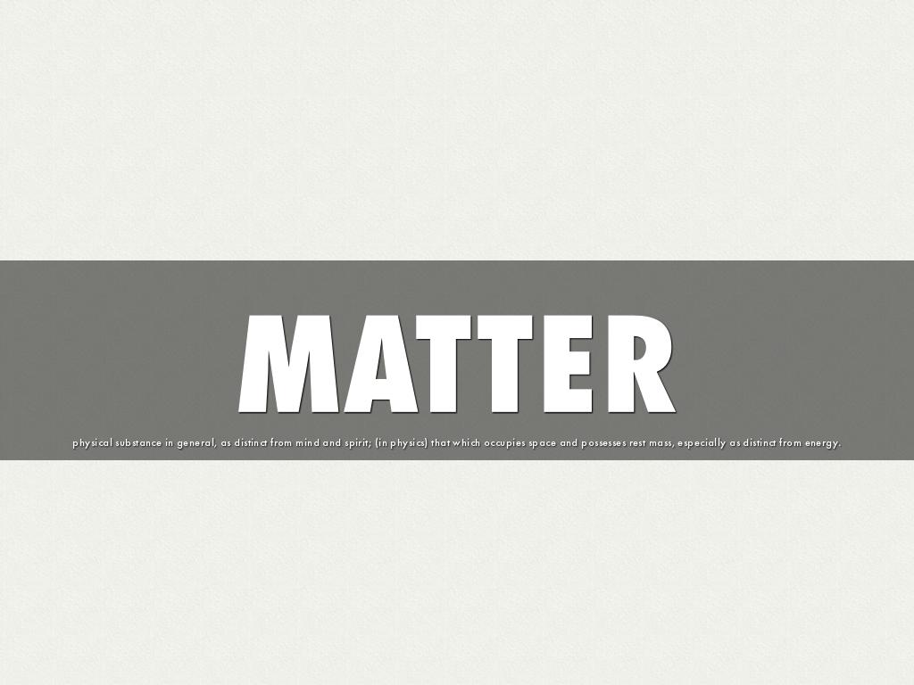 physical substance in general, as distinct from mind and spirit; (in physics) that which occupies space and possesses rest mass, especially as distinct from energy.