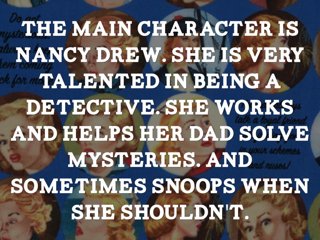 The main character is Nancy Drew. She is very talented in being a detective. She works and helps her dad solve mysteries. And sometimes snoops when she shouldn't.