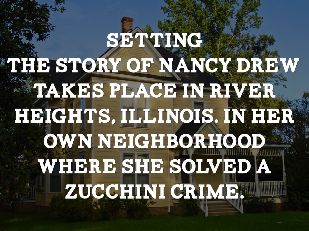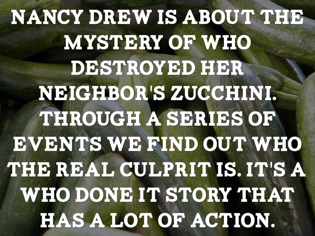 Nancy Drew is about the mystery of who destroyed her neighbor's zucchini. Through a series of events we find out who the real culprit is. It's a who done it story that has a lot of action.