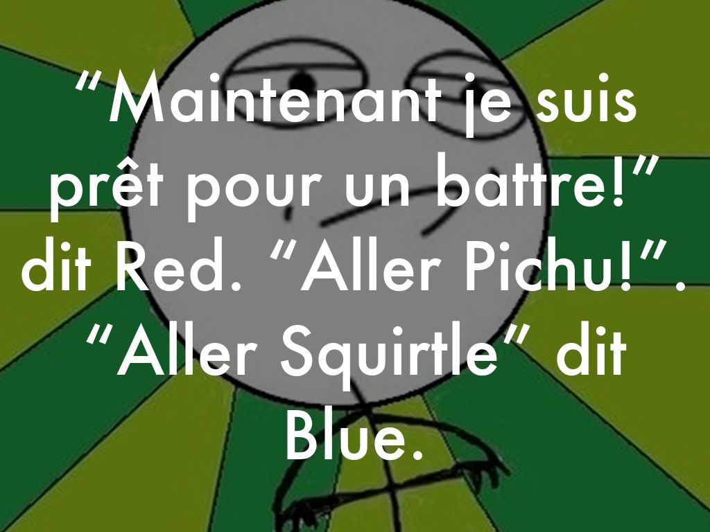 “Maintenant je suis prêt pour un battre!” dit Red. “Aller Pichu!”. “Aller Squirtle” dit Blue.