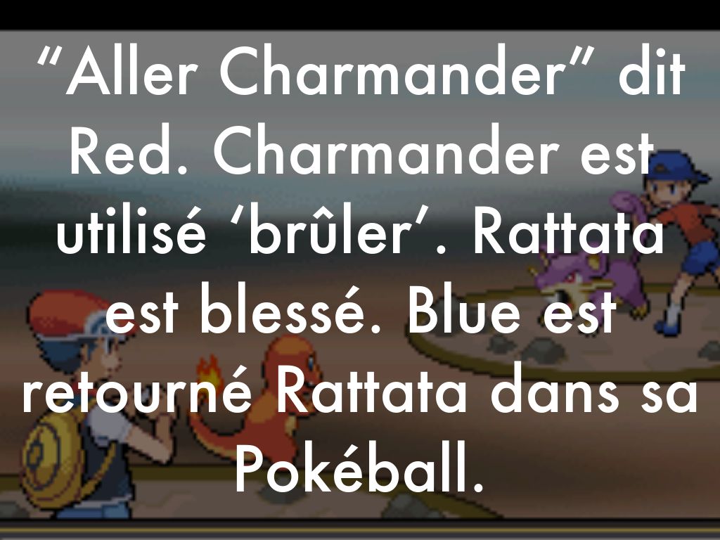 “Aller Charmander” dit Red. Charmander est utilisé ‘brûler’. Rattata est blessé. Blue est retourné Rattata dans sa Pokéball.