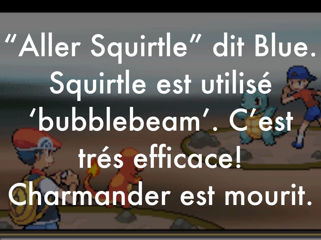 “Aller Squirtle” dit Blue. Squirtle est utilisé ‘bubblebeam’. C’est trés efficace! Charmander est mourit.