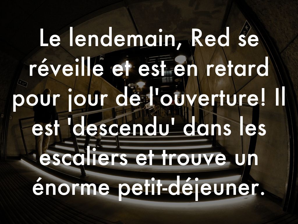Le lendemain, Red se réveille et est en retard pour jour de l'ouverture! Il est 'descendu' dans les escaliers et trouve un énorme petit-déjeuner.