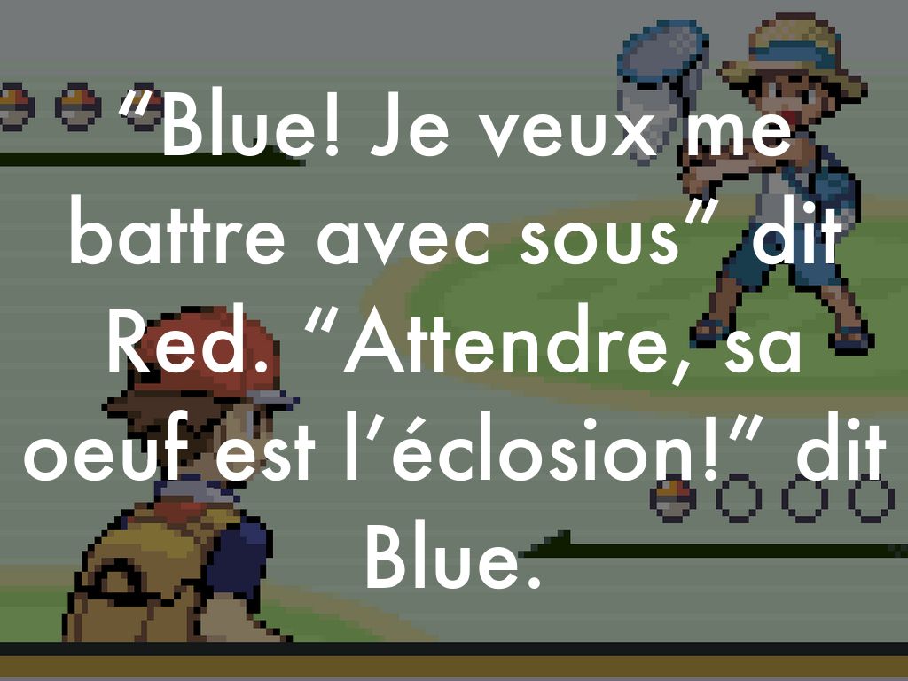 “Blue! Je veux me battre avec sous” dit Red. “Attendre, sa oeuf est l’éclosion!” dit Blue.