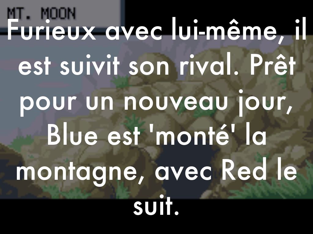 Furieux avec lui-même, il est suivit son rival. Prêt pour un nouveau jour, Blue est 'monté' la montagne, avec Red le suit.