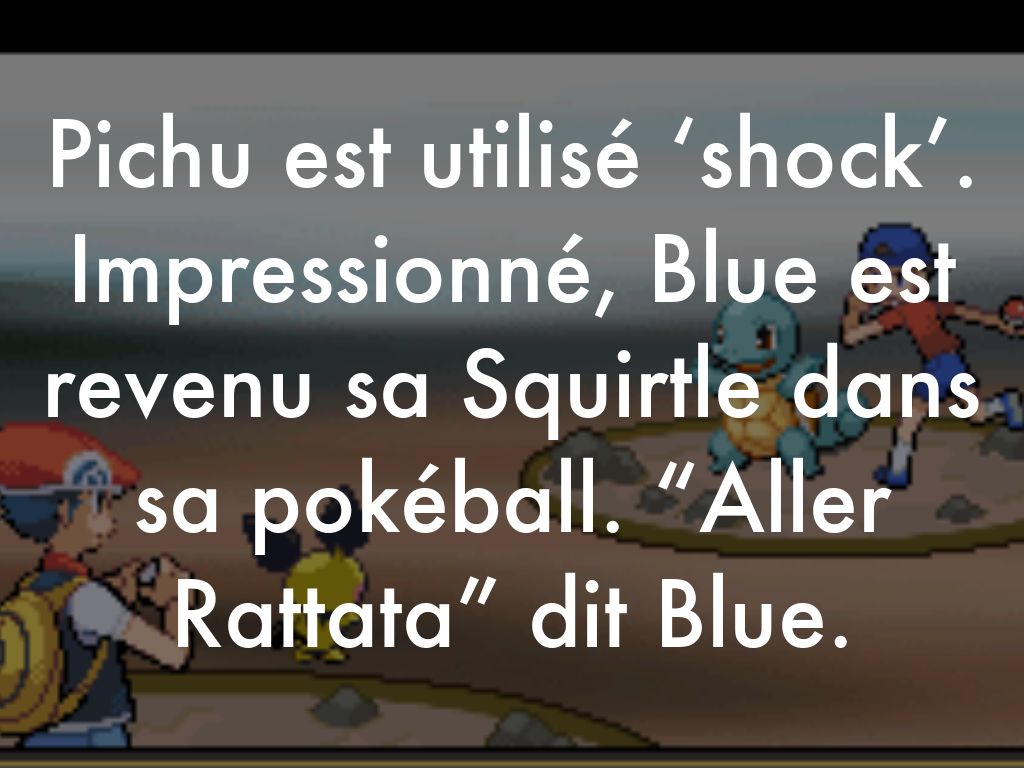 Pichu est utilisé ‘shock’. Impressionné, Blue est revenu sa Squirtle dans sa pokéball. “Aller Rattata” dit Blue.