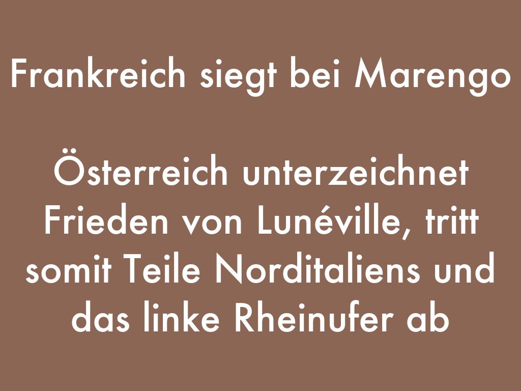 Österreich unterzeichnet Frieden von Lunéville, tritt somit Teile Norditaliens und das linke Rheinufer ab