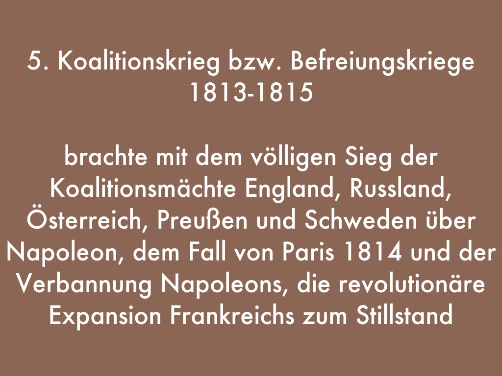 brachte mit dem völligen Sieg der Koalitionsmächte England, Russland, Österreich, Preußen und Schweden über Napoleon, dem Fall von Paris 1814 und der Verbannung Napoleons, die revolutionäre Expansion Frankreichs zum Stillstand