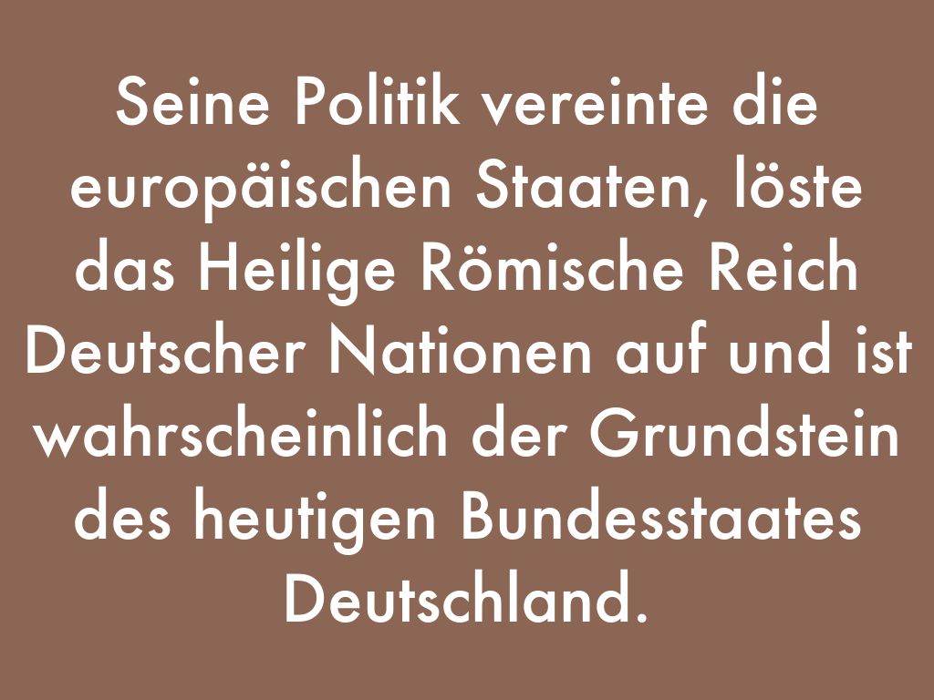 Seine Politik vereinte die europäischen Staaten, löste das Heilige Römische Reich Deutscher Nationen auf und ist wahrscheinlich der Grundstein des heutigen Bundesstaates Deutschland.