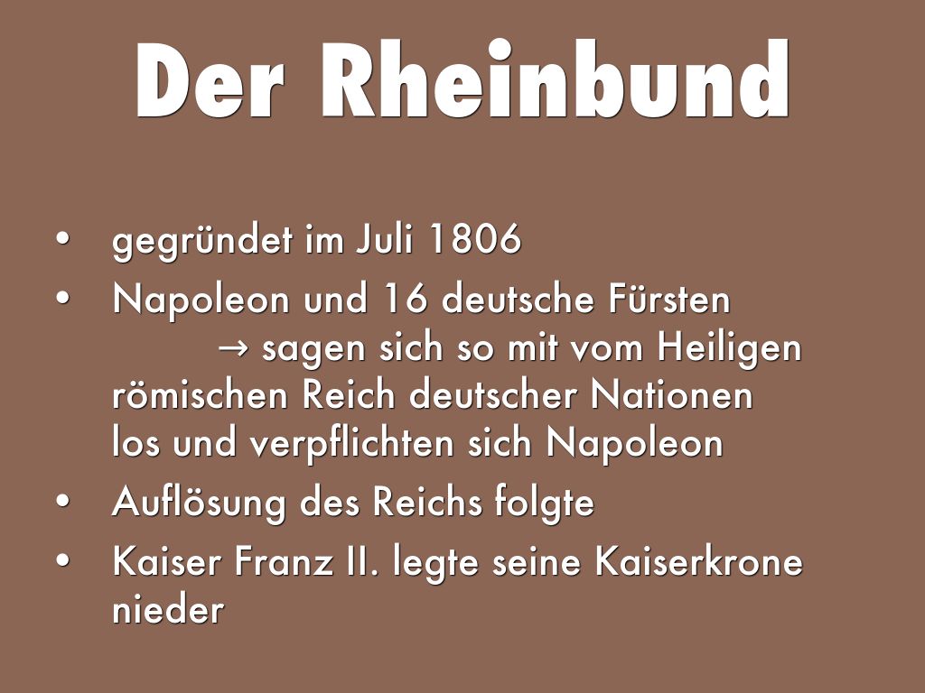 - Napoleon und 16 deutsche Fürsten → sagen sich so mit vom Heiligen römischen Reich deutscher Nationen los und verpflichten sich Napoleon