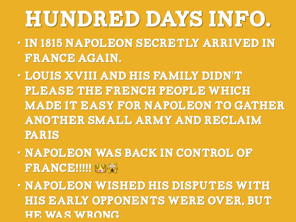 Soon the allies held complete control of France , and allowed napoleon to escape to an island near Italy in exchange for the Thrown of France. Louis xviii became king of France.