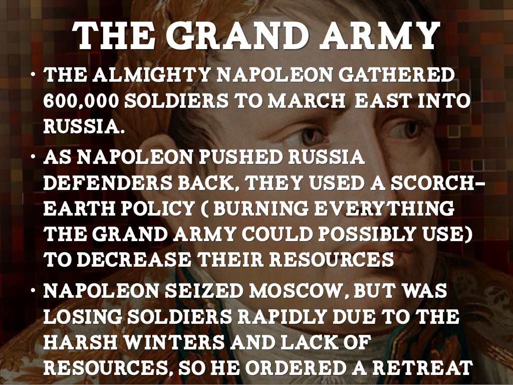 As Napoleon pushed Russia defenders back, they used a scorch- earth policy ( burning everything the Grand Army could possibly use) to decrease their resources