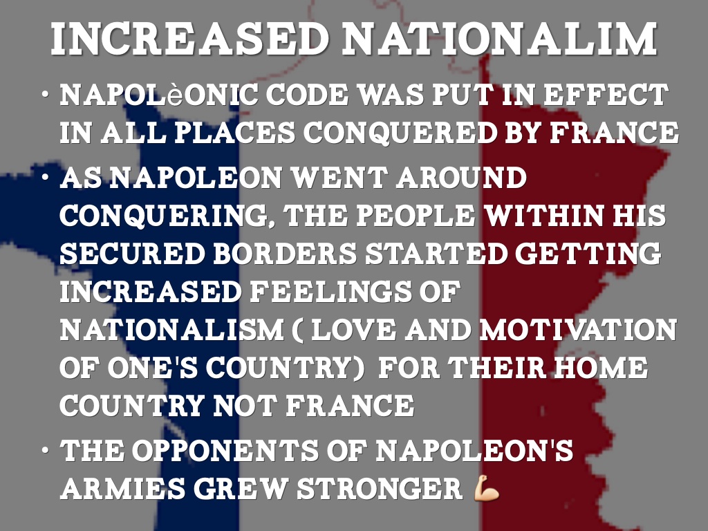 As Napoleon went around conquering, the people within his secured borders started getting increased feelings of nationalism ( love and motivation of one's country) for their home country not France