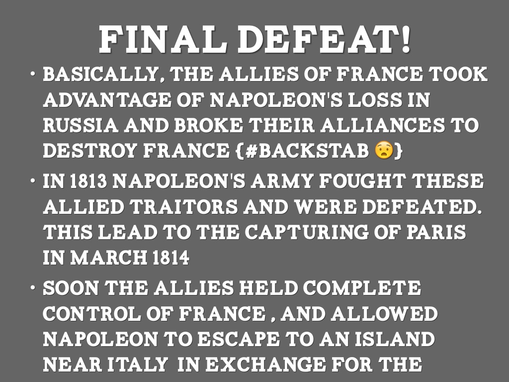Basically, the allies of France took advantage of napoleon's loss in Russia and broke their Alliances to destroy France {#Backstab 😧}