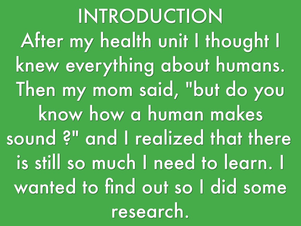 After my health unit I thought I knew everything about humans. Then my mom said, "but do you know how a human makes sound ?" and I realized that there is still so much I need to learn. I wanted to find out so I did some research.