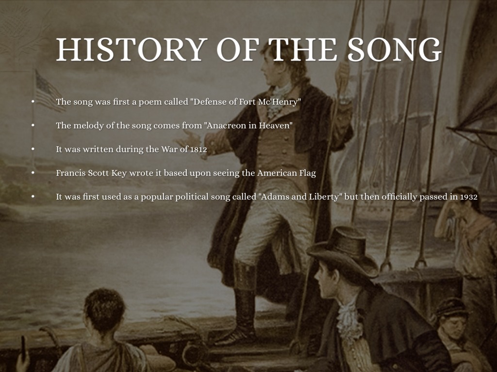 "“The Star-Spangled Banner”." UXL Encyclopedia of U.S. History. Sonia Benson, Daniel E. Brannen, Jr., and Rebecca Valentine. Vol. 7. Detroit: UXL, 2009. 1476-1478. Student Resources In Context. Web. 23 Oct. 2013. .