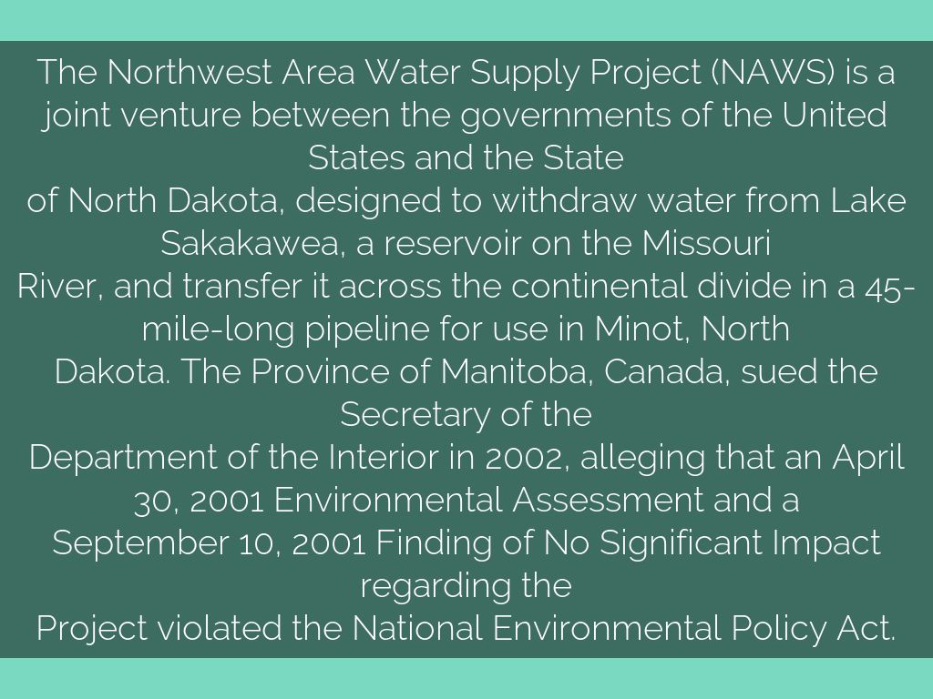 The source of this protracted dispute is the Northwest Area The Northwest Area Water Supply Project (NAWS) is a joint venture between the governments of the United States and the State