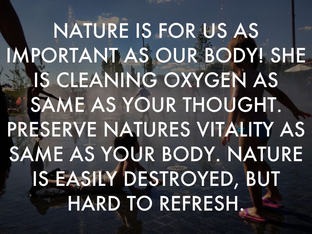 NATURE IS FOR US AS IMPORTANT AS OUR BODY! SHE IS CLEANING OXYGEN AS SAME AS YOUR THOUGHT. PRESERVE NATURES VITALITY AS SAME AS YOUR BODY. NATURE IS EASILY DESTROYED, BUT HARD TO REFRESH.