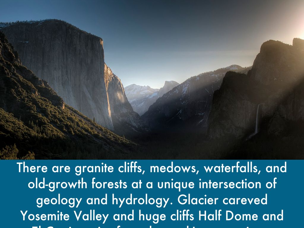 There are granite cliffs, medows, waterfalls, and old-growth forests at a unique intersection of geology and hydrology. Glacier careved Yosemite Valley and huge cliffs Half Dome and El Capitan rise from the park's centerpiece.