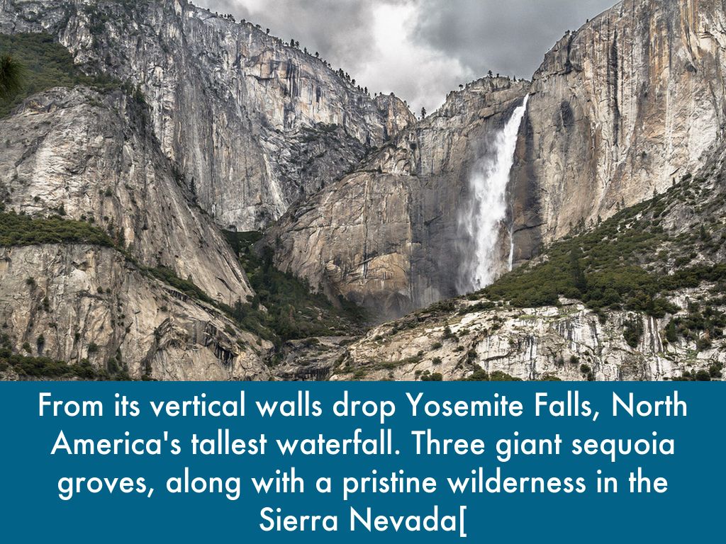 From its vertical walls drop Yosemite Falls, North America's tallest waterfall. Three giant sequoia groves, along with a pristine wilderness in the Sierra Nevada[