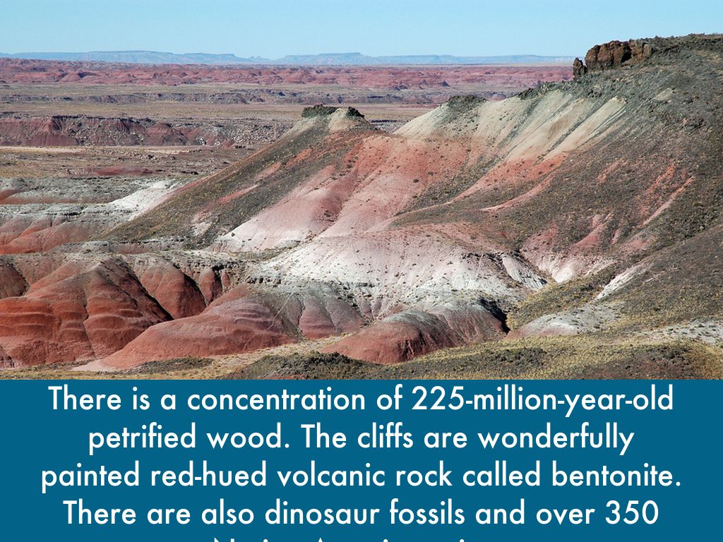 There is a concentration of 225-million-year-old petrified wood. The cliffs are wonderfully painted red-hued volcanic rock called bentonite. There are also dinosaur fossils and over 350 Native American sites.